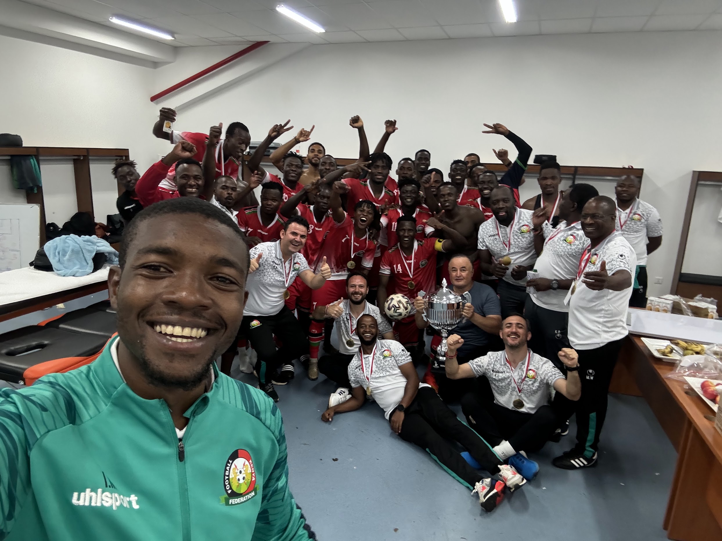 A rare dressing room photo of the team celebrating after winning the Four Nations tournament in Malawi, in March 2024. I had to get myself in one of the shots.